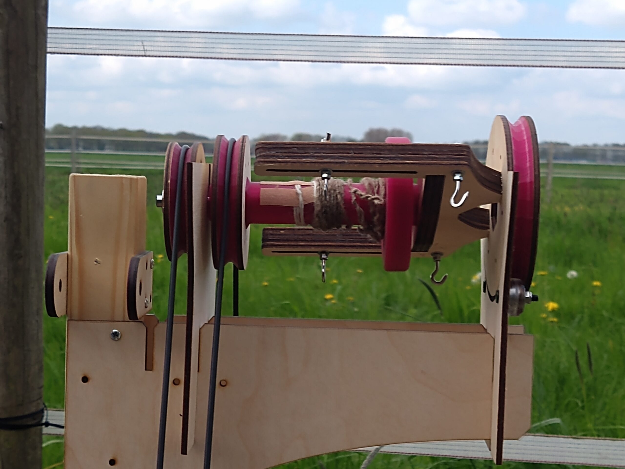 Uiteindelijk is het allemaal wel een beetje gelukt, maar de constructie liet ons hier en daar nog wat in de steek en het ding maakte enorm veel kabaal. Maar we hebben er een eerste draadje op kunnen spinnen! En de resultaten hebben ons genoeg vertrouwen en inspratie gegeven om te werken aan een tweede spinnewiel.